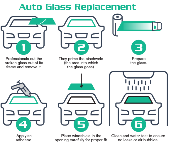 In an auto glass replacement, the technician will cut the broken glass out of its frame and remove it. They will then prepare the opening for a new piece of glass. In the case of a windshield replacement, he or she does so by priming the pinchweld (the area into which the glass goes) and checking it for corrosion or other damage to the vehicle.