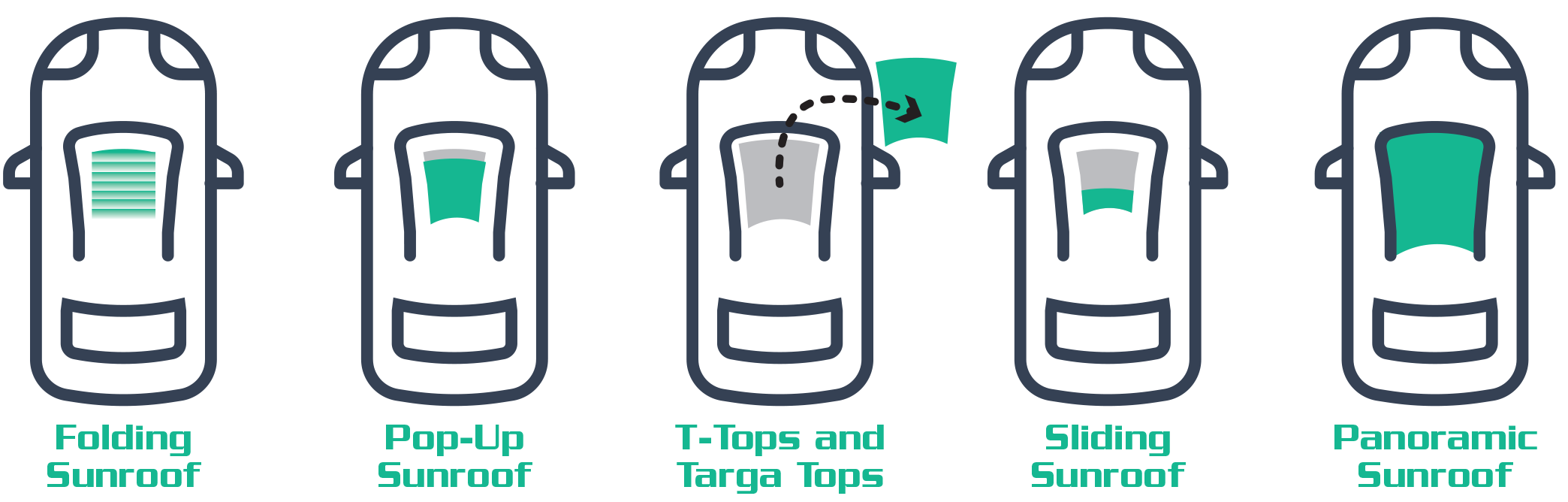 T-tops and Targa Tops: Although not what traditionally comes to mind when one thinks of a sunroof, these are indeed considered to be versions of one. T-tops consist of two removable roof panels- one on the driver's side and one on the passenger's side- that leave a support beam running down the middle of the car. A targa top is similar except that it is a single large panel, eliminating the need for a center beam. This offers the ultimate open air feel without stepping up to the realm of a convertible.